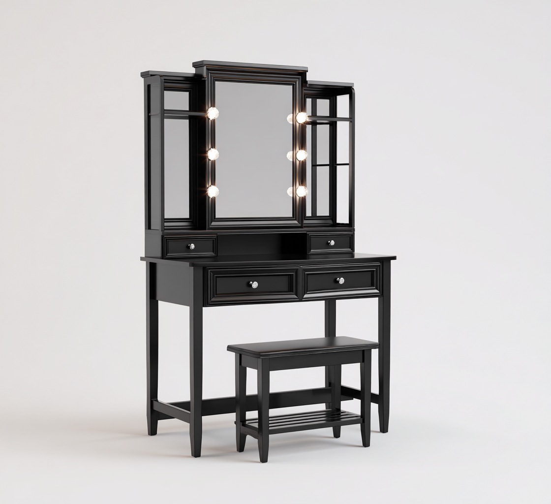 Coiffeuse bois avec miroir éclairé et tabouret pour chambre noir 130x45x145 cm - design moderne