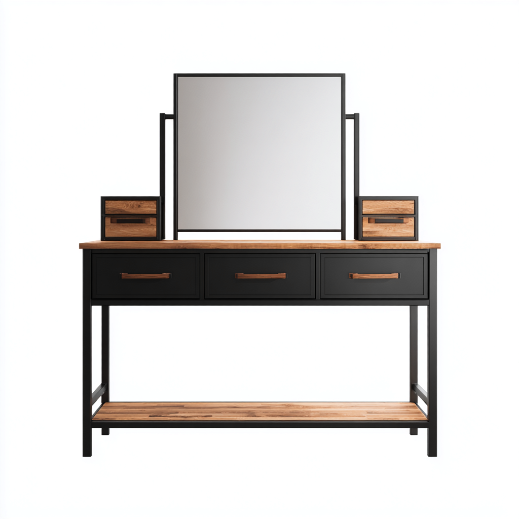 Coiffeuse en bois et métal 120x40x140 cm - bois naturel et noir - style industriel - avec miroir - adaptée à la chambre