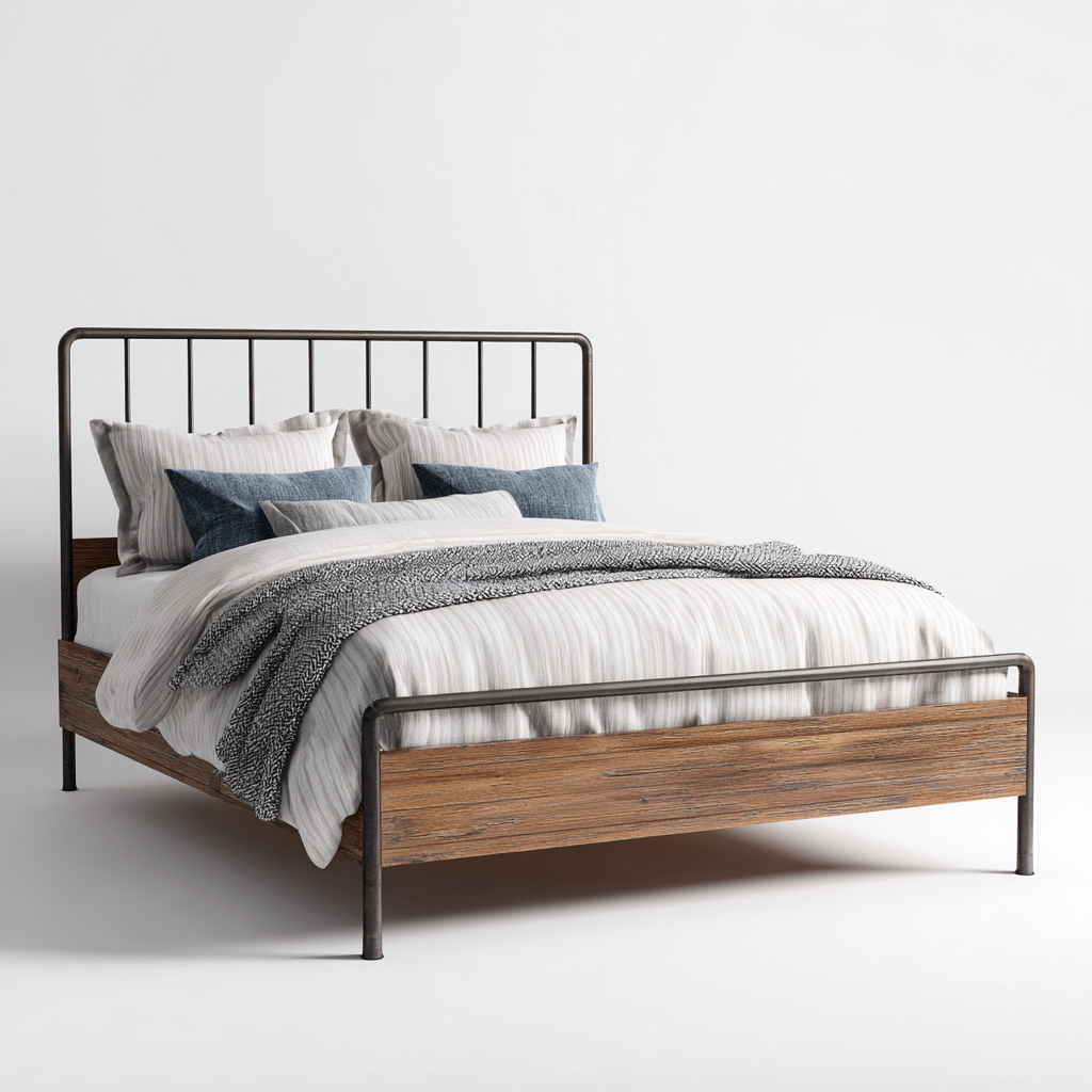 Lit double structure métal et bois pour chambre noir - marron 212x165x110 cm - style industriel