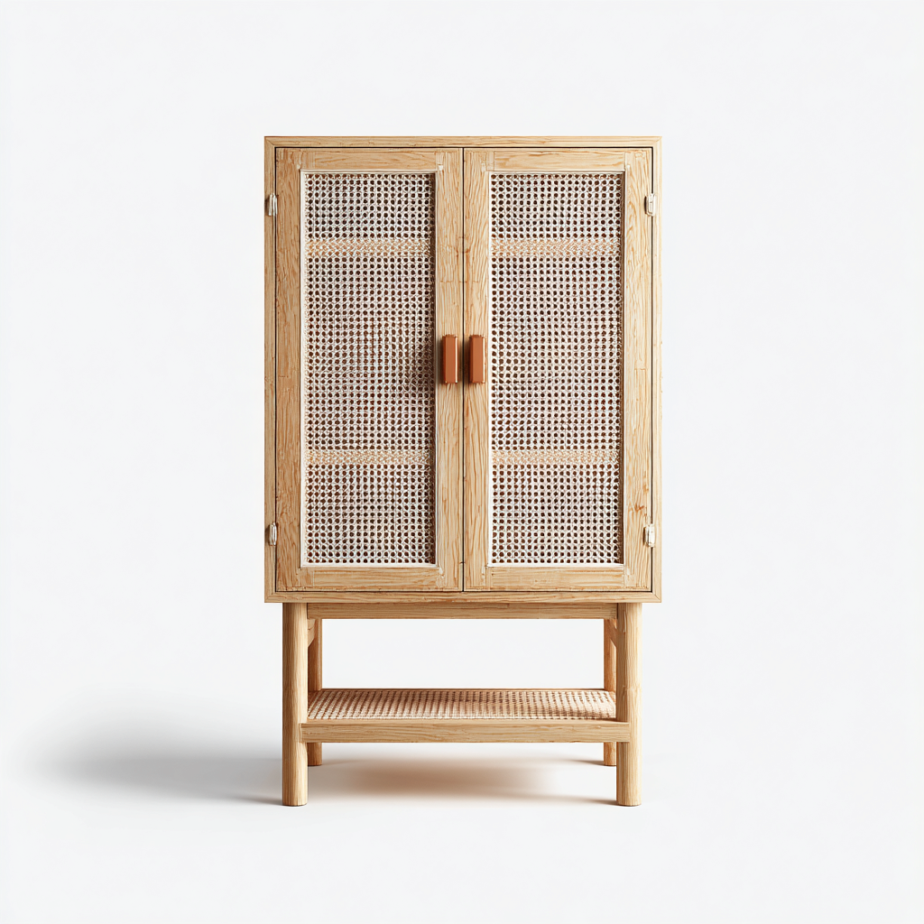 Rangement de salle de bain sur pied bois et cannage 60x35x120 cm - bois naturel - pour salle de bain - style naturel avec espace de rangement