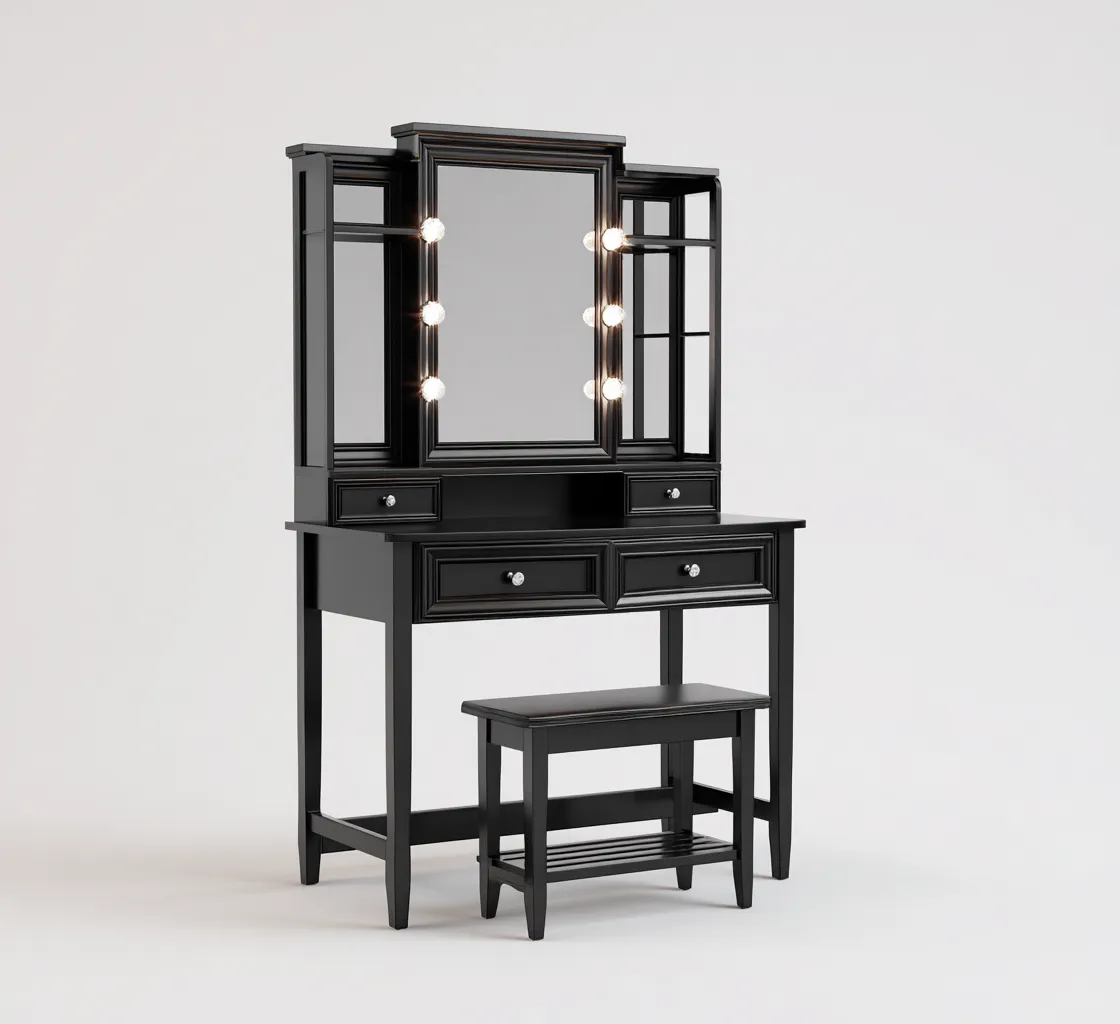 Coiffeuse en bois avec miroir éclairé 110x40x160 cm - noir - style classique - avec éclairage intégré - adaptée à la chambre