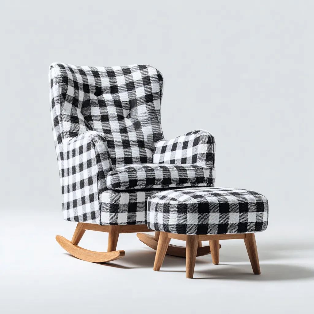 Fauteuil à bascule avec repose-pieds en bois et tissu rembourré 90x85x100 cm - noir et blanc - pour salon ou coin détente - style contemporain
